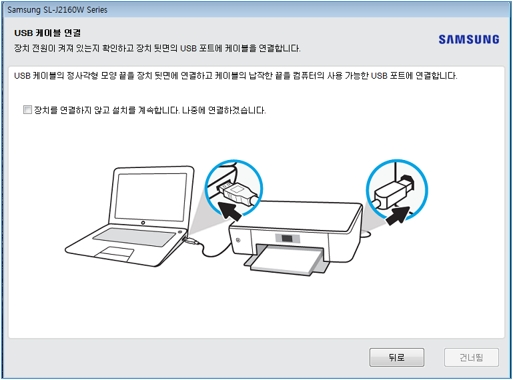 - 설치 유형을 선택합니다. USB 케이블로 직접 연결하는 경우 ‘USB 연결’을, 무선 또는 유선 네트워크를 통해 연결하는 경우 ‘네트워크 연결’을 선택합니다.